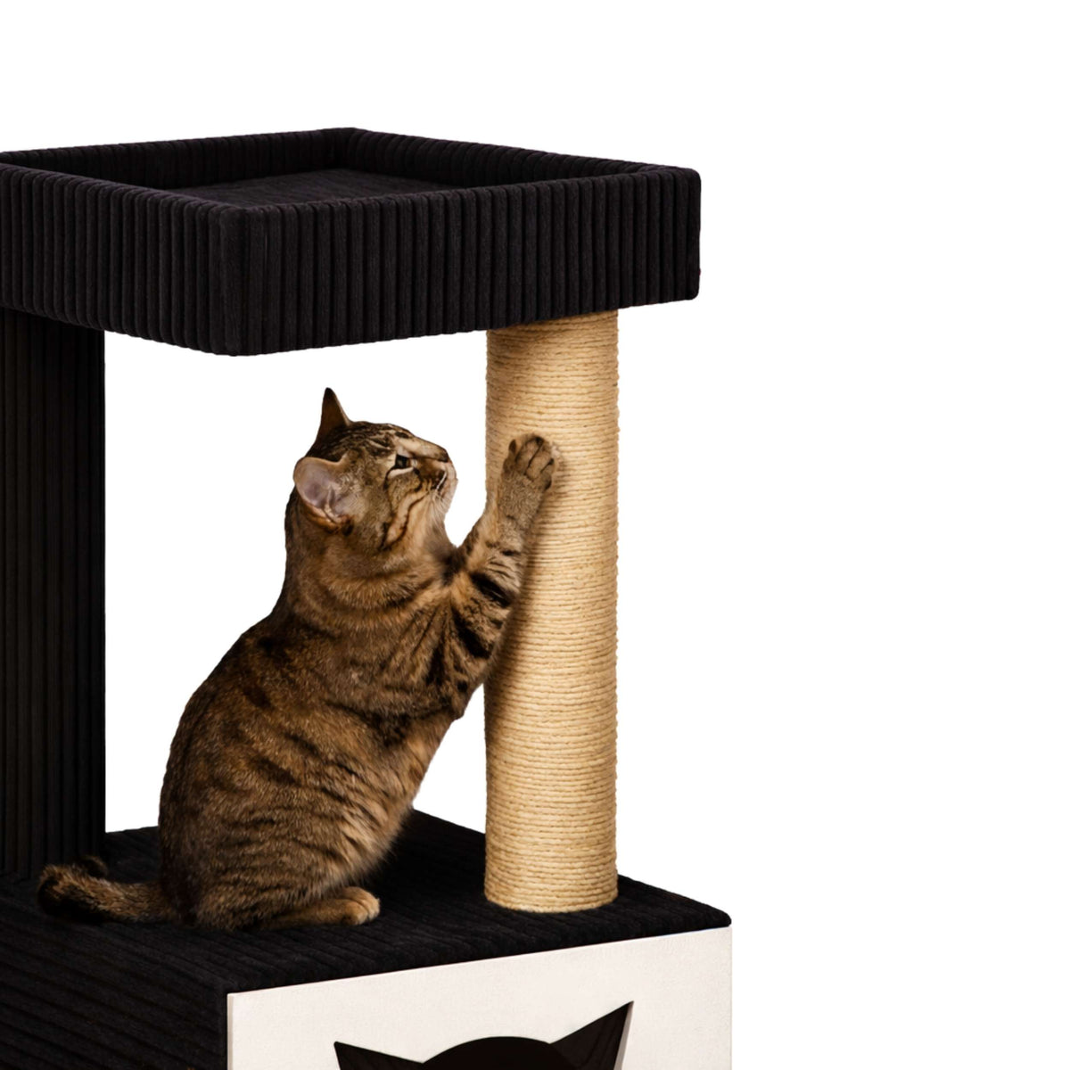 The durable scratching post is wrapped in natural agave sisal and provides a strong scratching surface for daily claw care. This supports your cat’s natural instincts while also helping protect your furniture. With its slim modern design and availability in multiple colours, this cat tree works as both a practical and visually refined addition to a range of interior styles.